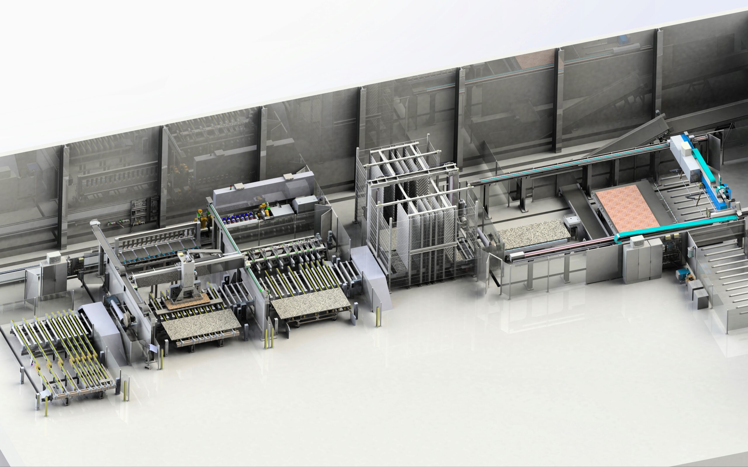The production plant shown is used for the fully automated production of oven housing made of natural stone and ceramics. The individual processing machines are aligned and connected to one another. This enables a continuous material flow without interruption.